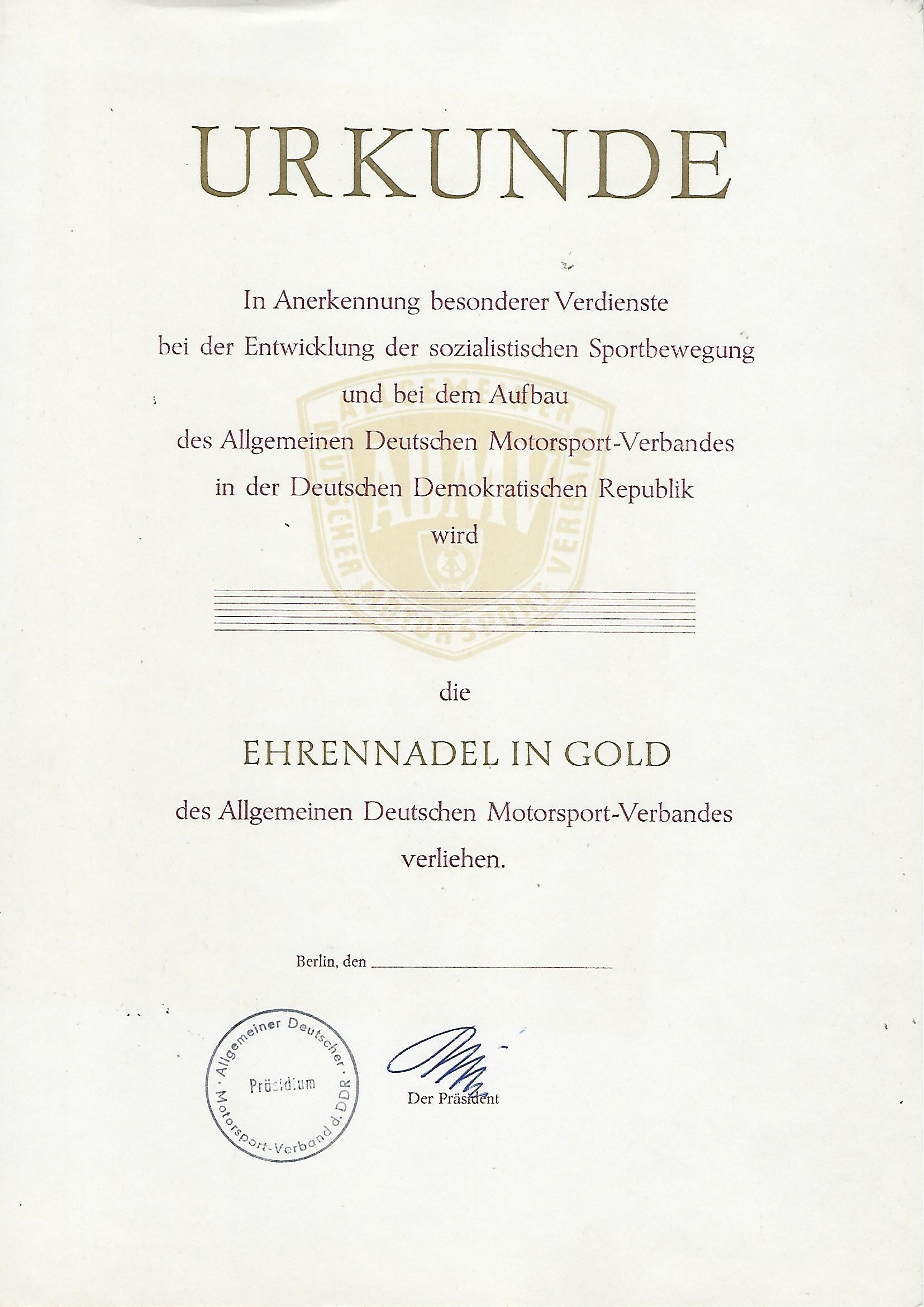 Urkunde die Ehrennadel des Allgemeinen Deutschen Motorsport-Verbandes der DDR in Gold |