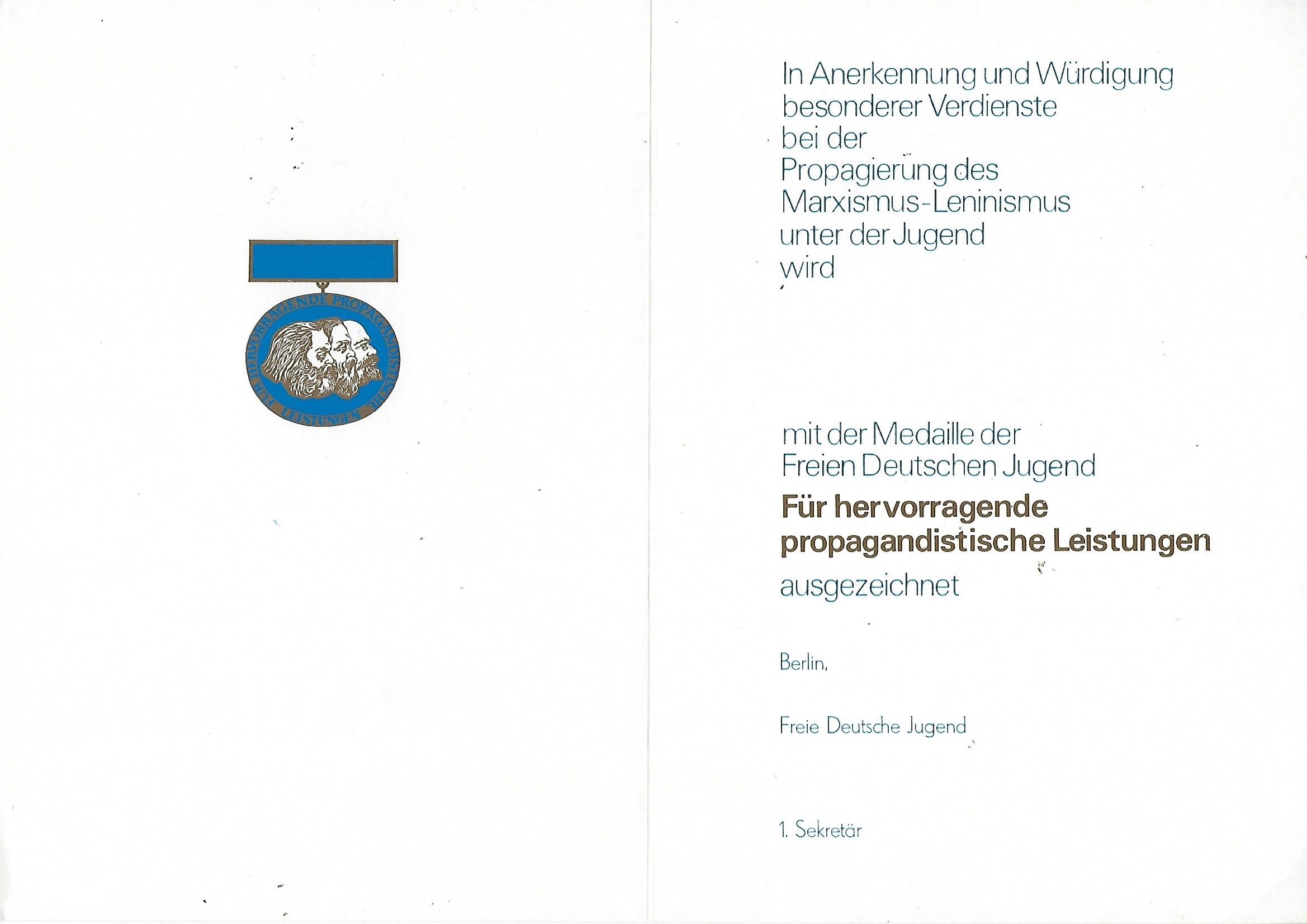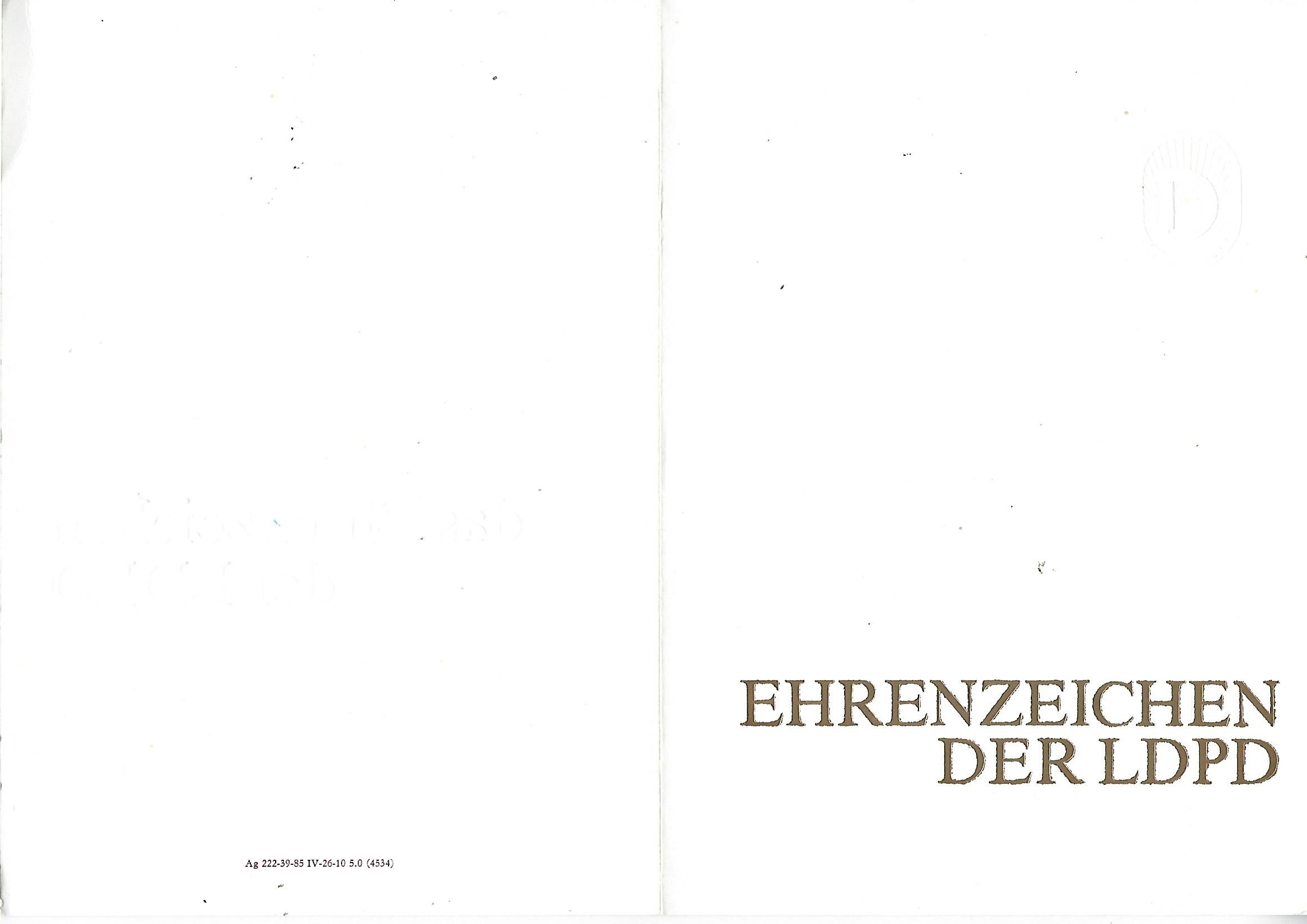 Urkunde Ehrenzeichen der LDPD ( Liberal-Demokratische Partei Deutschlands ) |