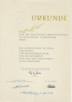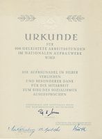 Urkunde für 500 Geleistete Arbeitsstunden im Nationalen Aufbauwerk |