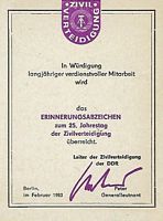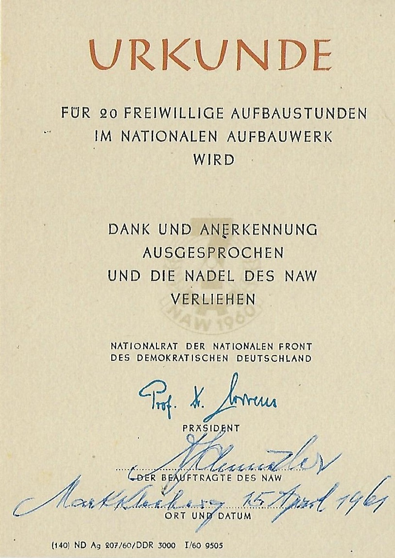 Urkunde für 20 Geleistete Arbeitsstunden im Nationalen Aufbauwerk |