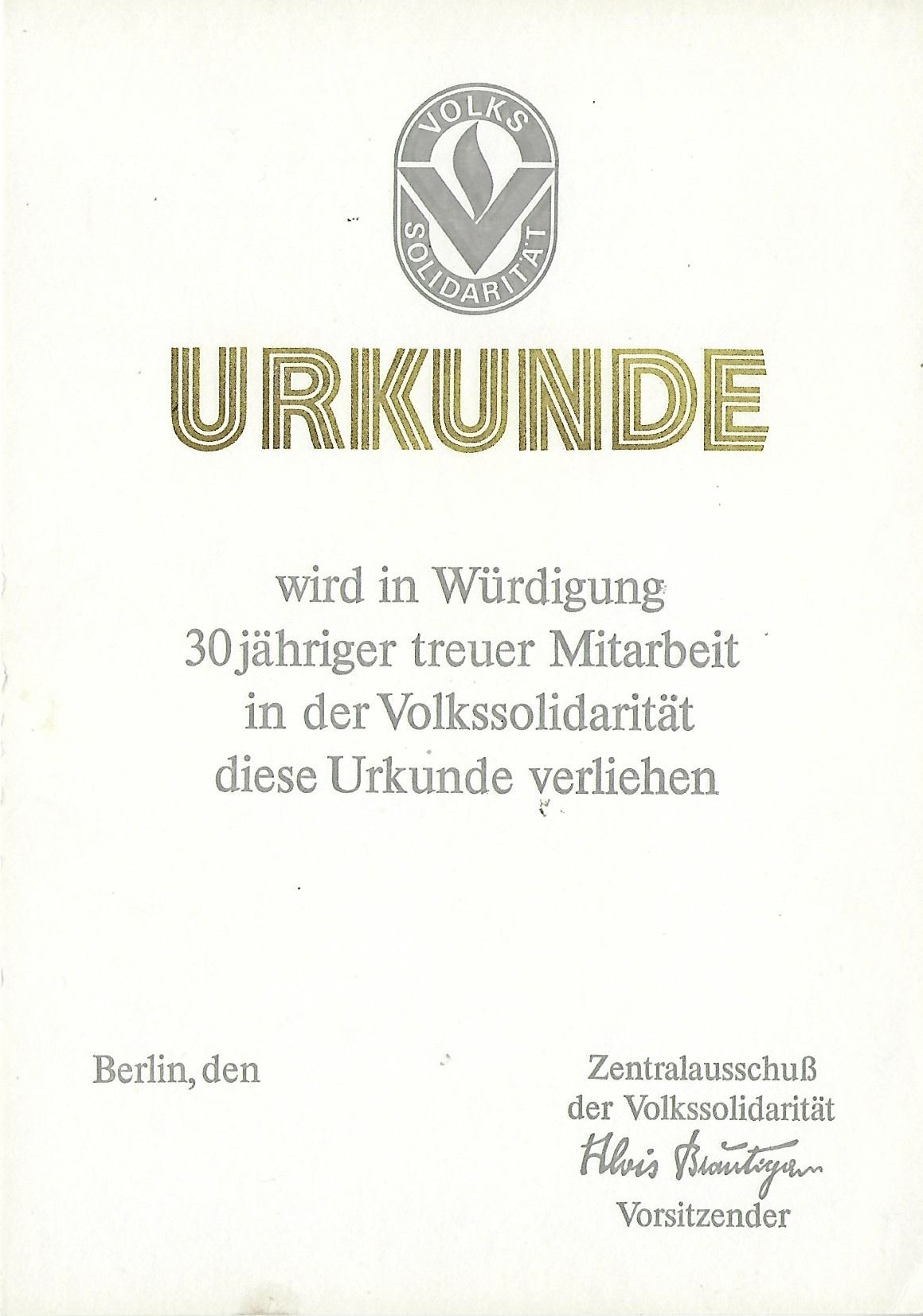 Urkunde 30 jährige treuer Mitarbeit in der Volkssolidarität |
