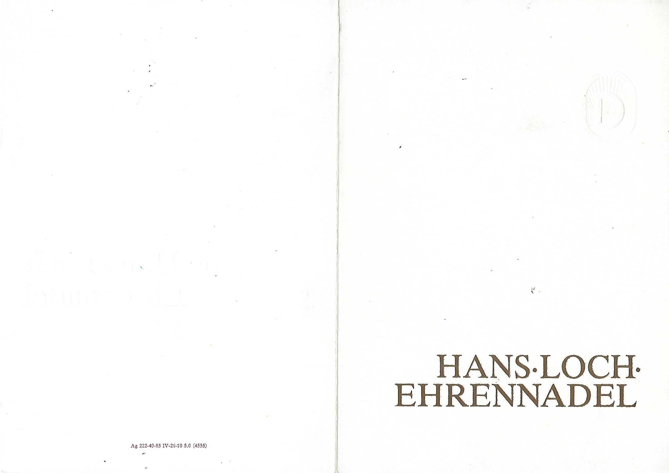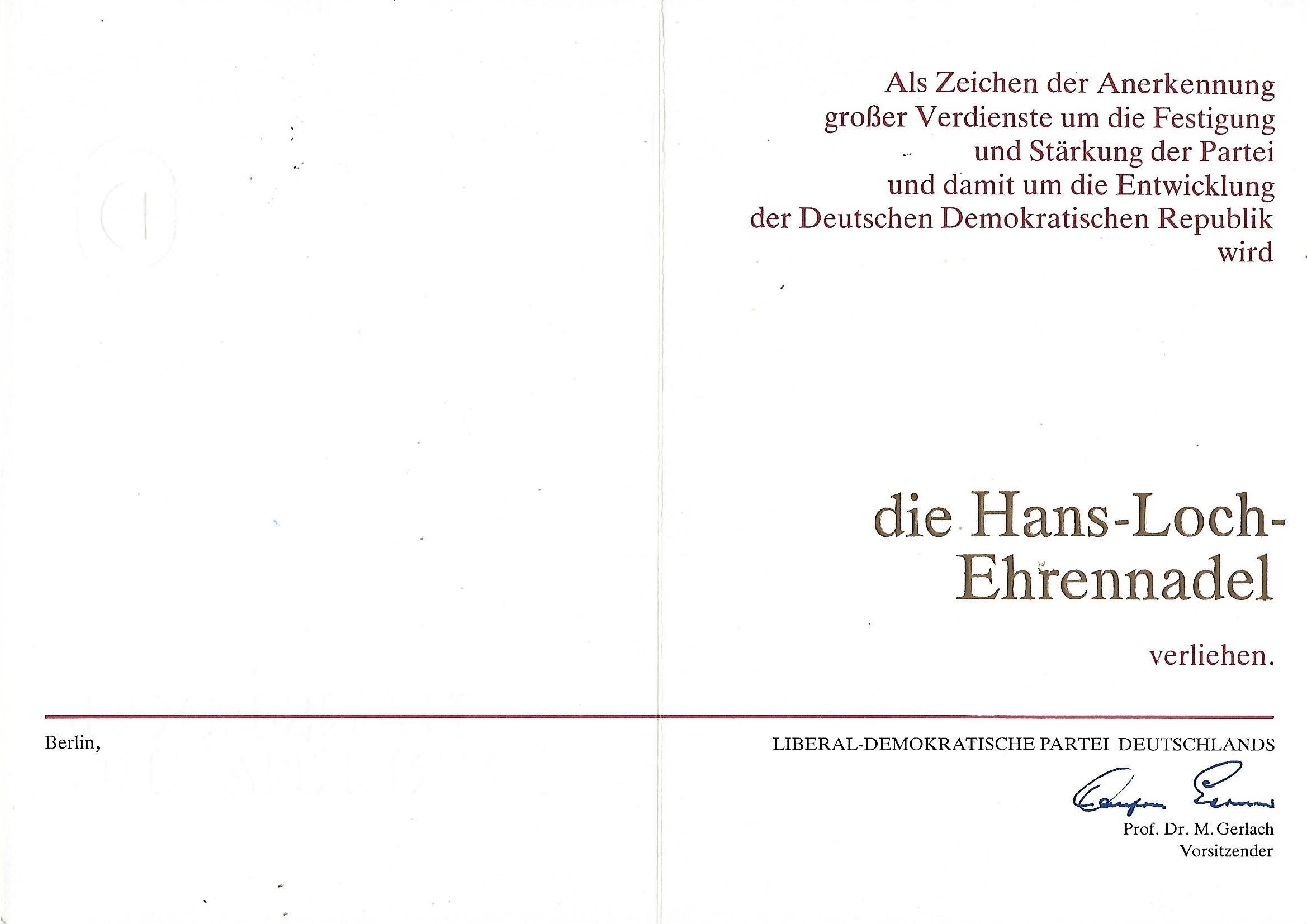 Urkunde Hans Loch Ehrennadel LDPD ( Liberal-Demokratische Partei Deutschlands ) |