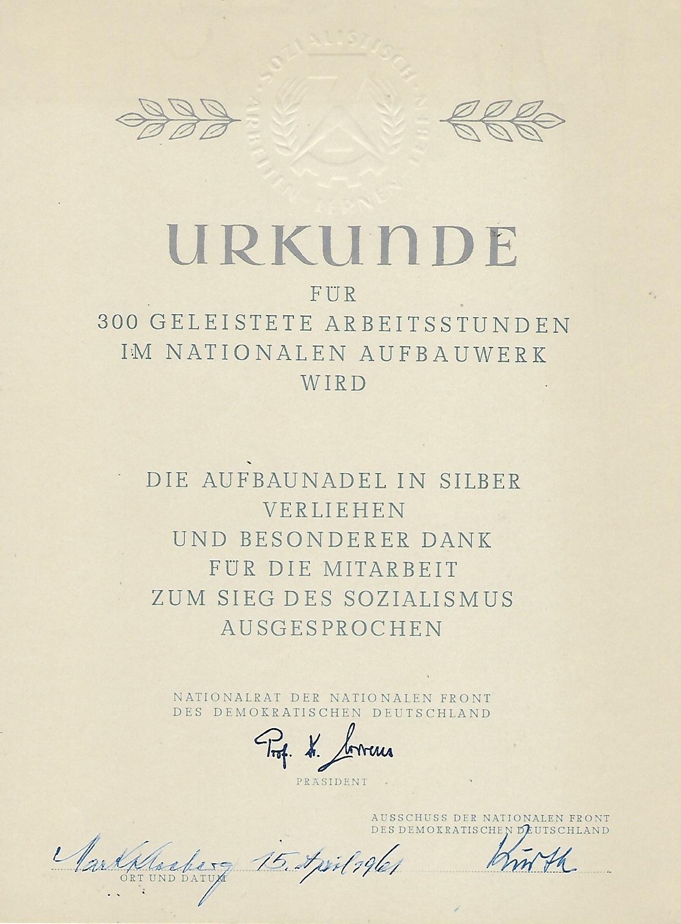 Urkunde für 300 Geleistete Arbeitsstunden im Nationalen Aufbauwerk |