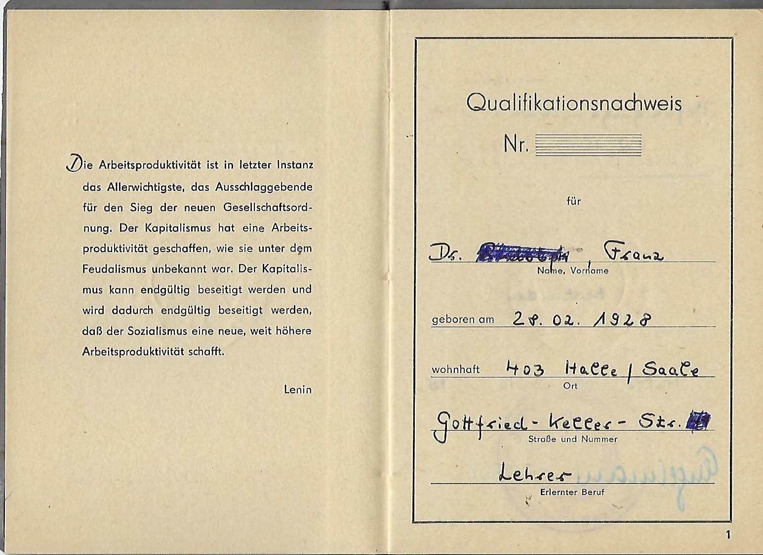 Heft Qualifikationsnachweis Nr. für Dr... Halle / Saale |
