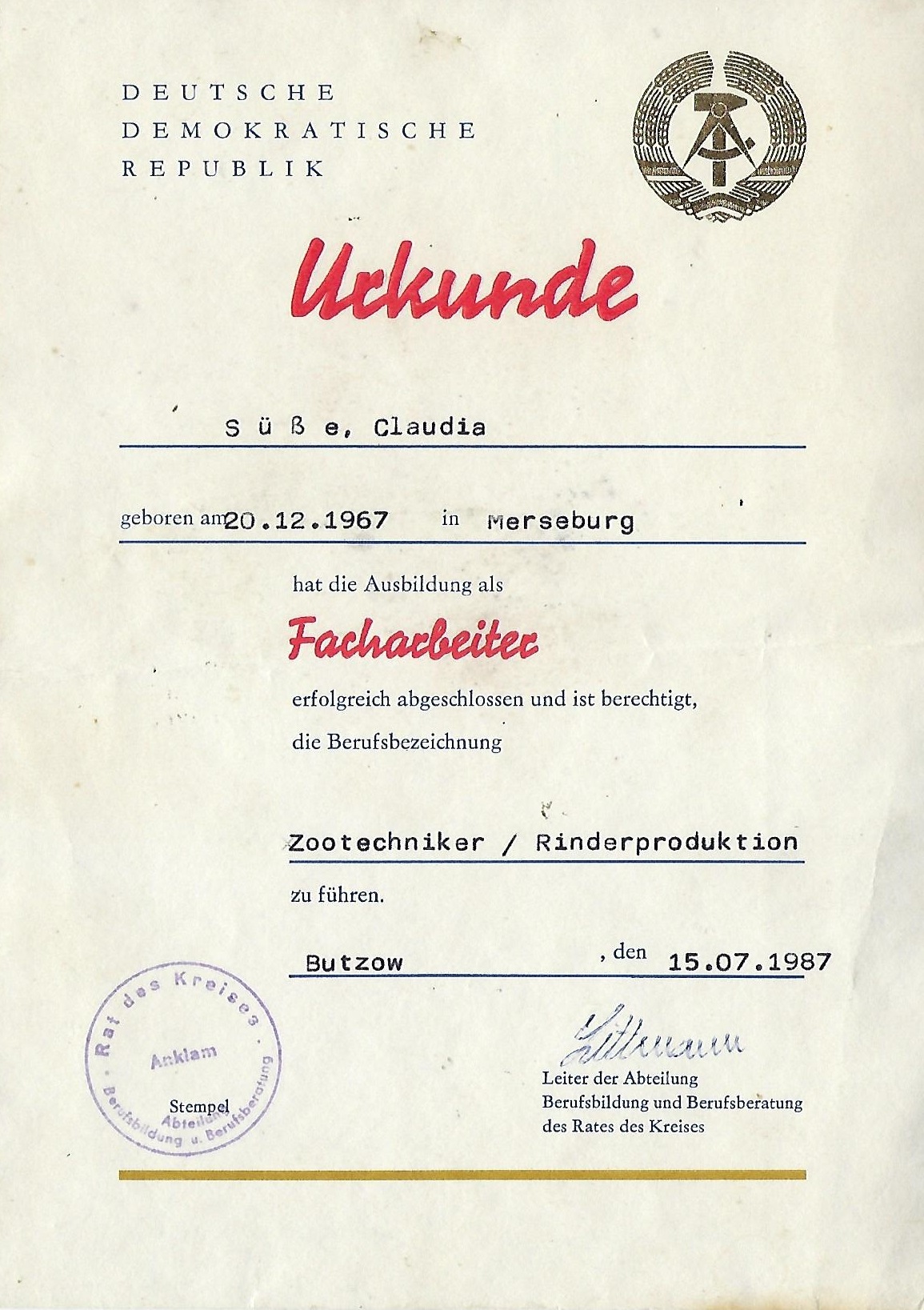 Urkunde über die Qualifikation als Facharbeiter ...berechtigt die Berufsbezeichnung / Speziallisierungsrichtung... |