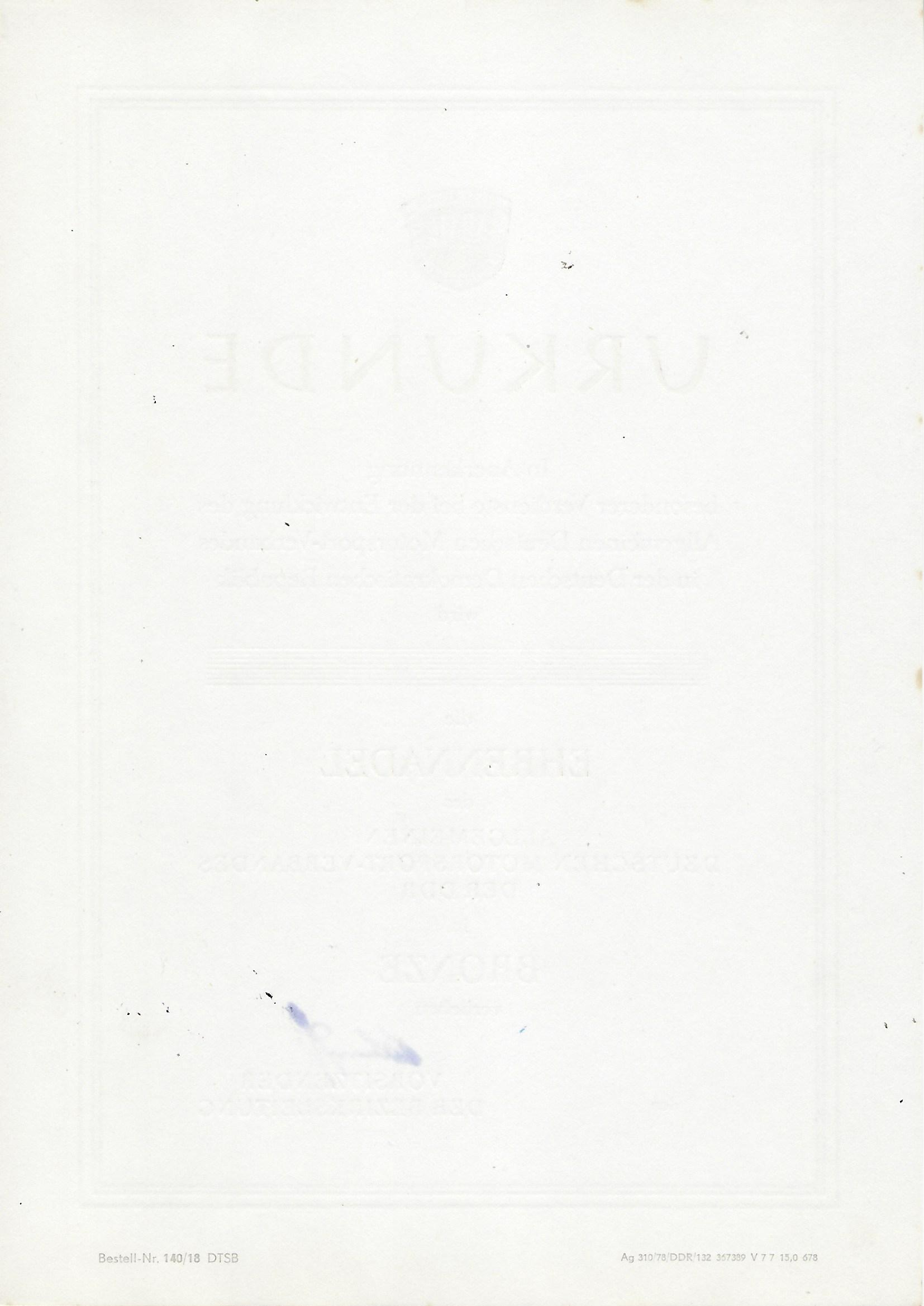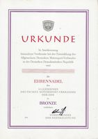 Urkunde die Ehrennadel des Allgemeinen Deutschen Motorsport-Verbandes der DDR in Bronze |