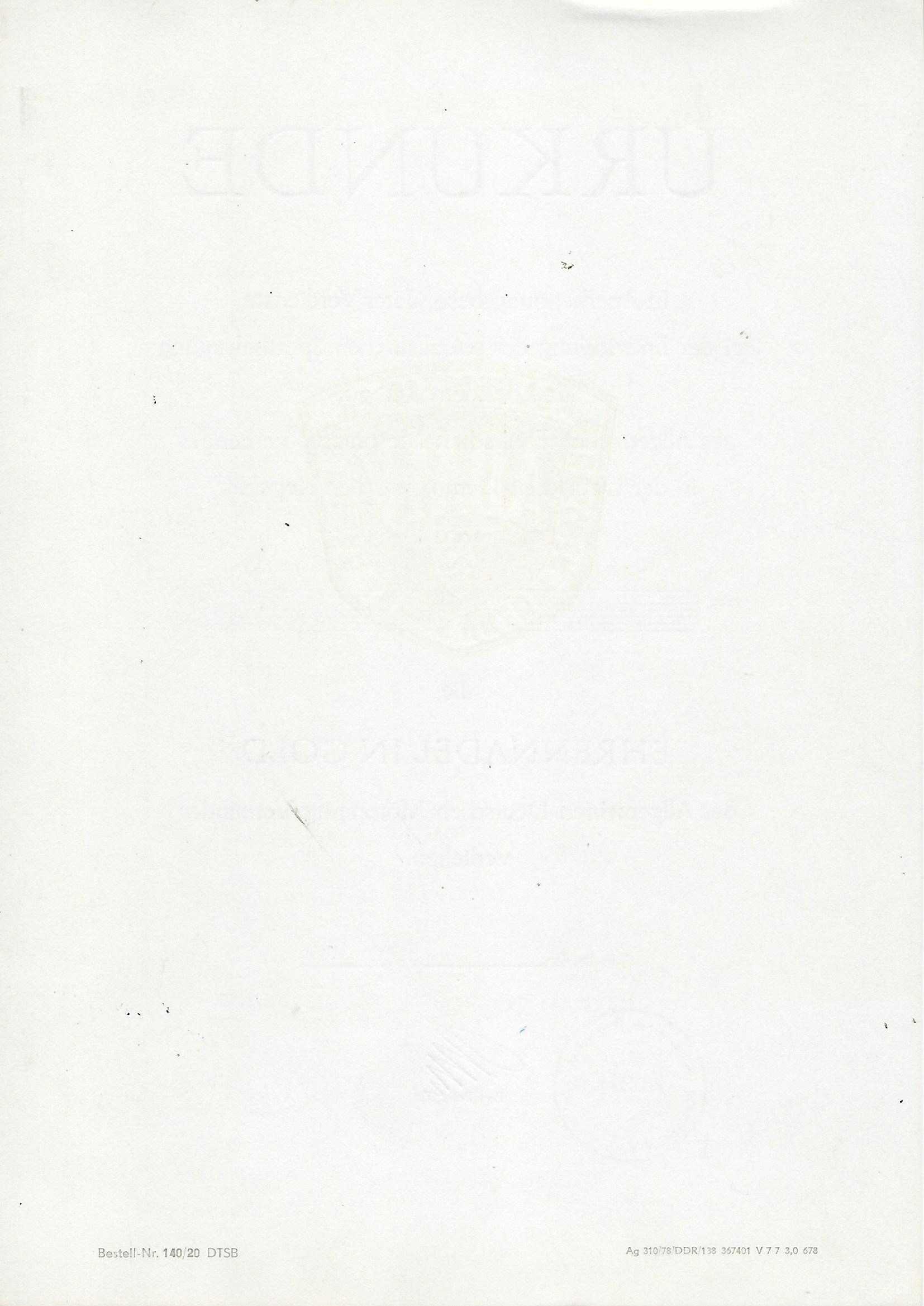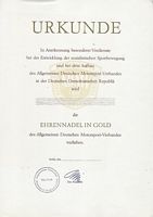 Urkunde die Ehrennadel des Allgemeinen Deutschen Motorsport-Verbandes der DDR in Gold |