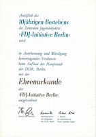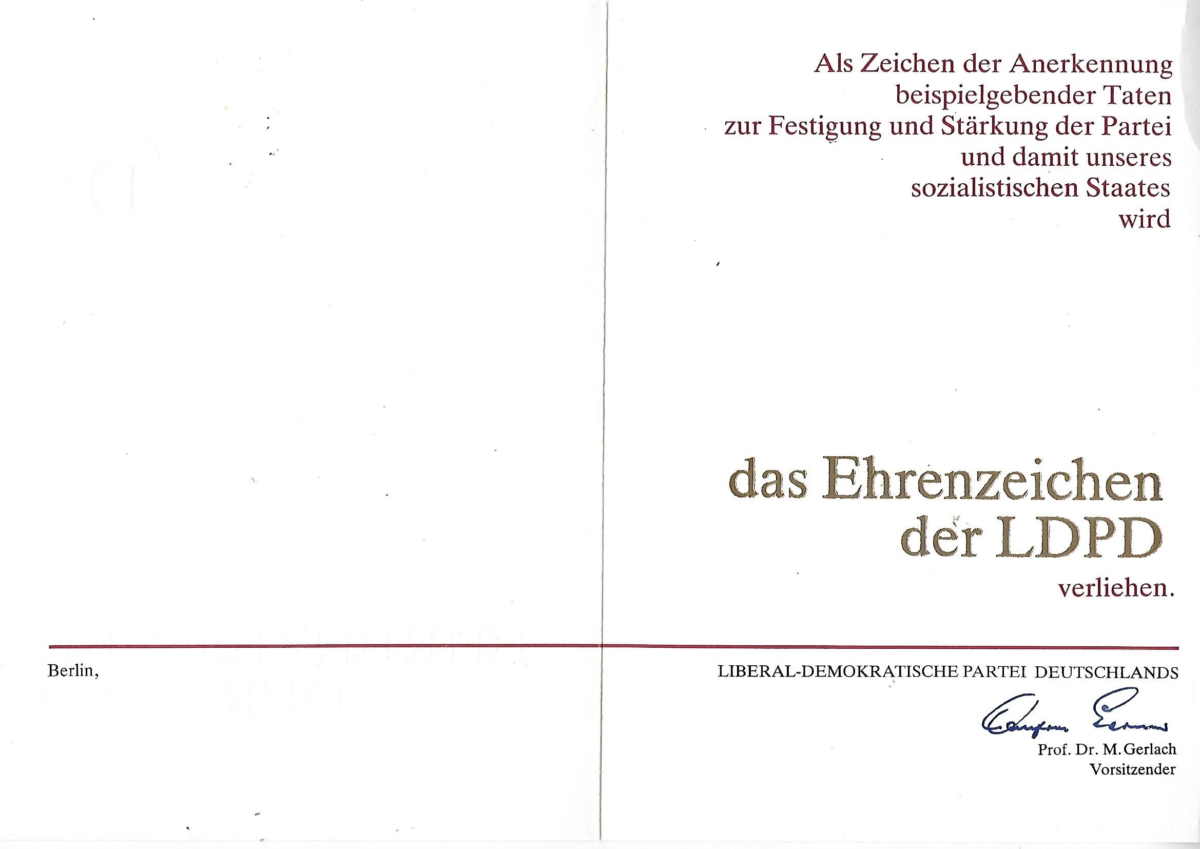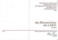 Urkunde Ehrenzeichen der LDPD ( Liberal-Demokratische Partei Deutschlands ) |