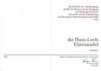 Urkunde Hans Loch Ehrennadel LDPD ( Liberal-Demokratische Partei Deutschlands ) |