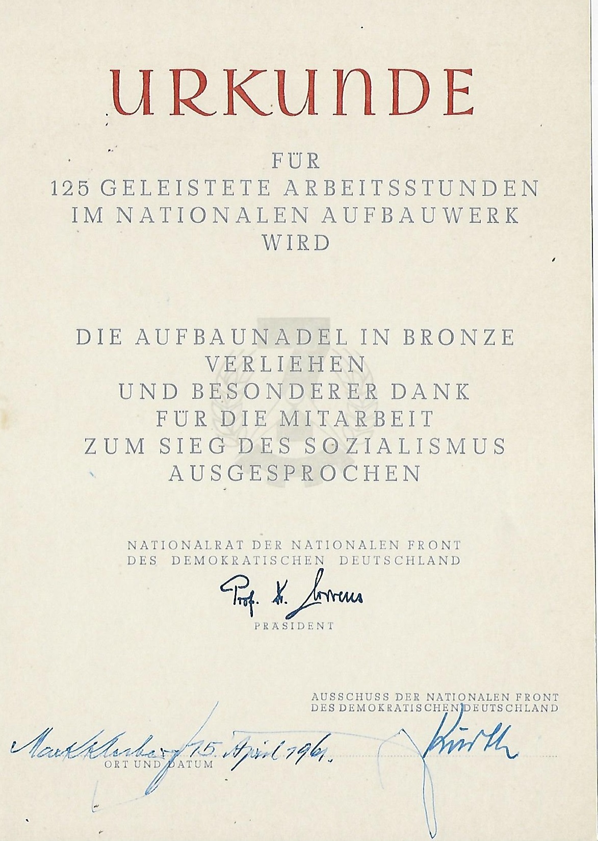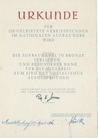 Urkunde für 125 Geleistete Arbeitsstunden im Nationalen Aufbauwerk |