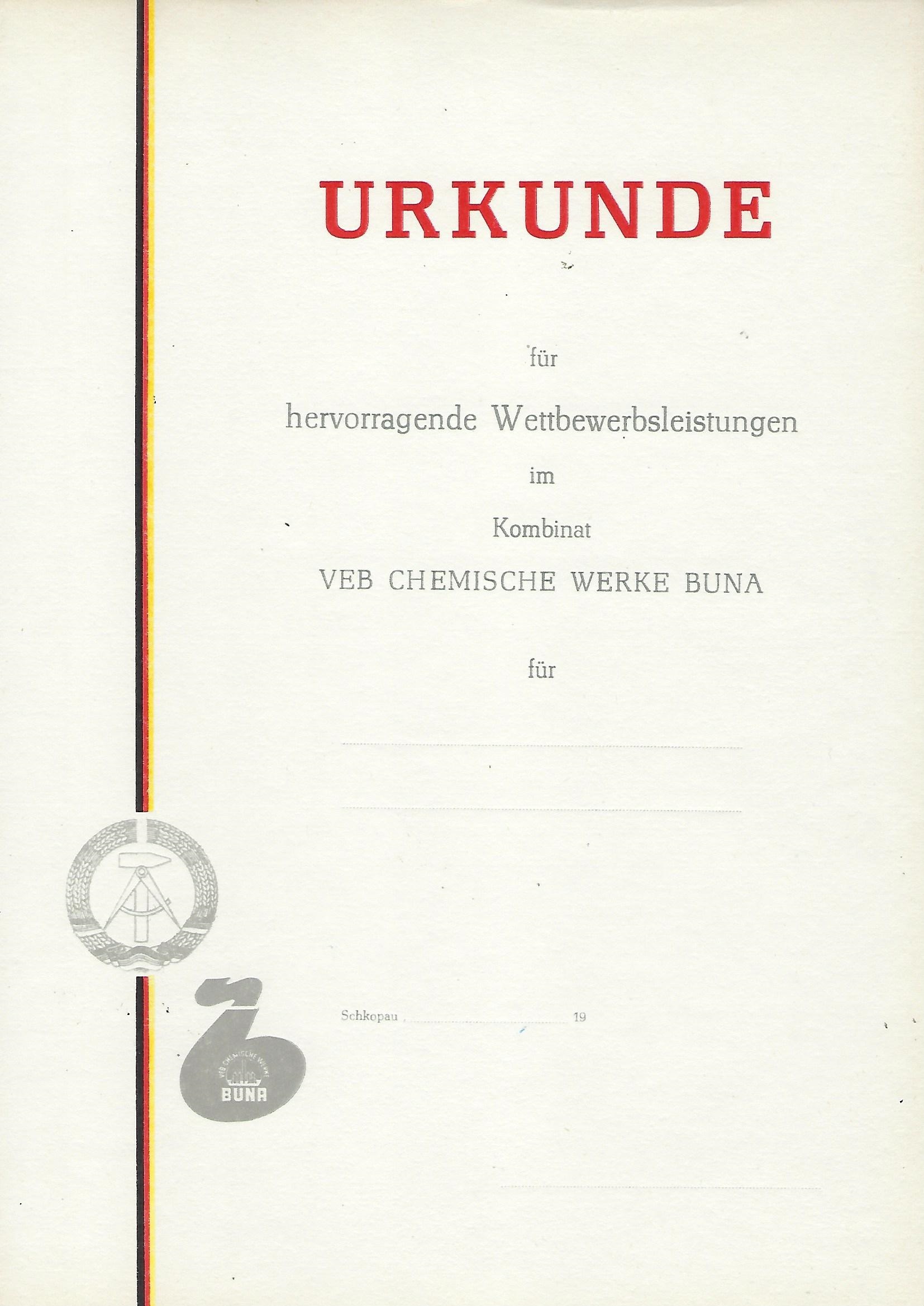 Urkunde für hervorragende Wettbewerbsleistungen im Kombinat VEB Chemische Werke Buna |