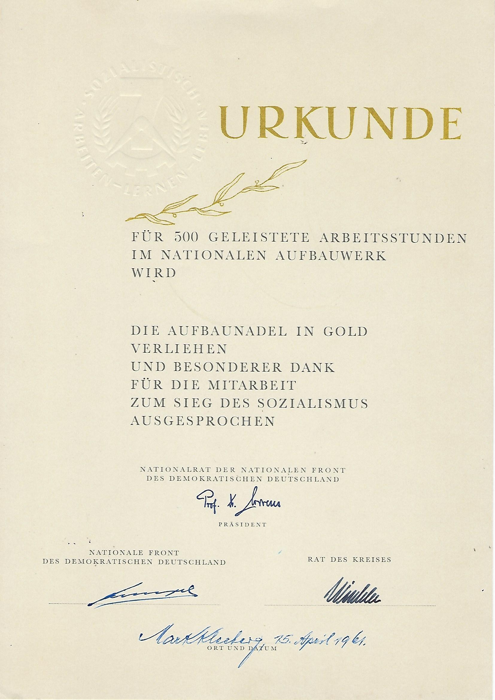 Urkunde für 500 Geleistete Arbeitsstunden im Nationalen Aufbauwerk |