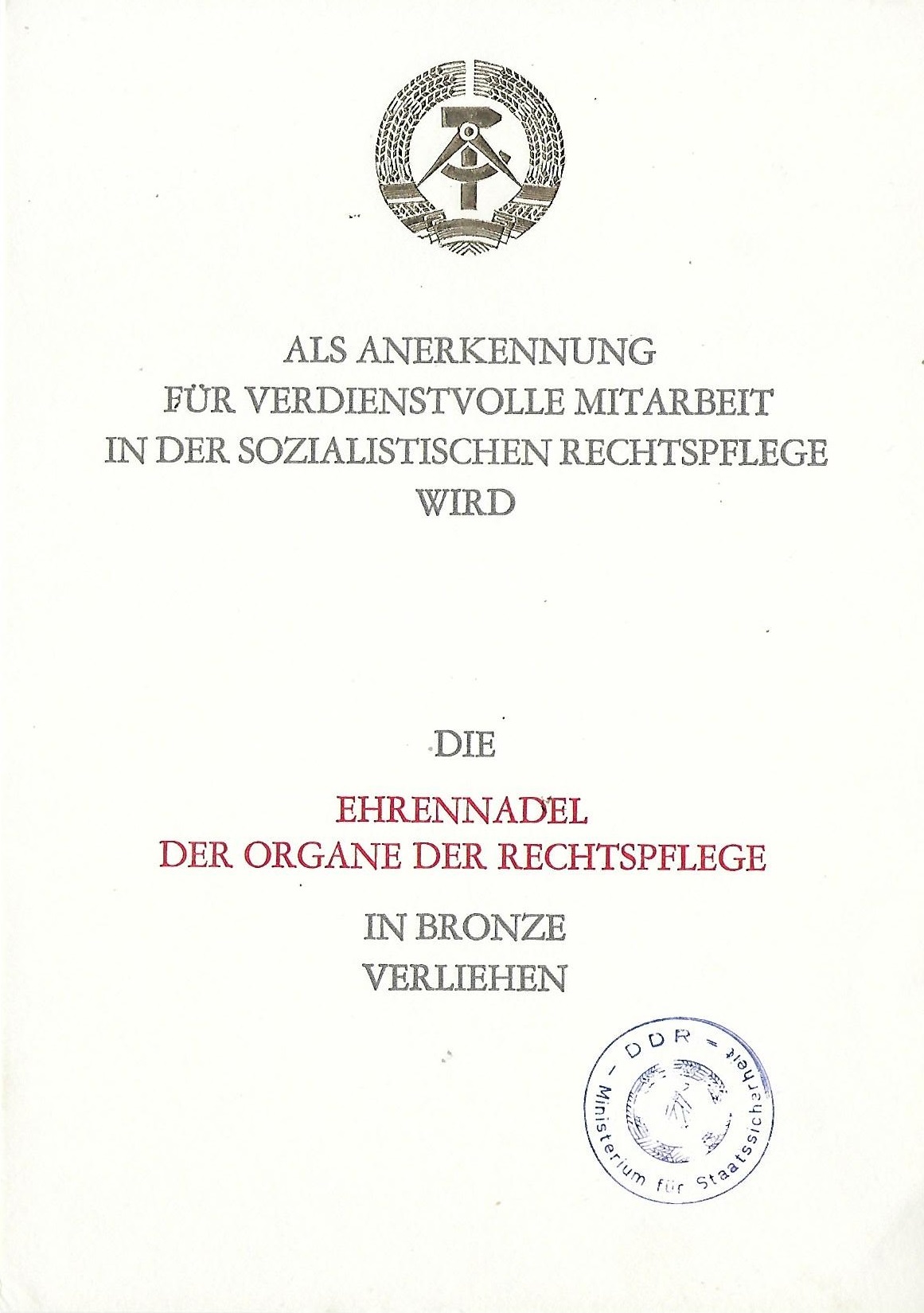 Sozialistische Rechtspflege - Ehrennadel der Organe der Rechtspflege in Bronze |