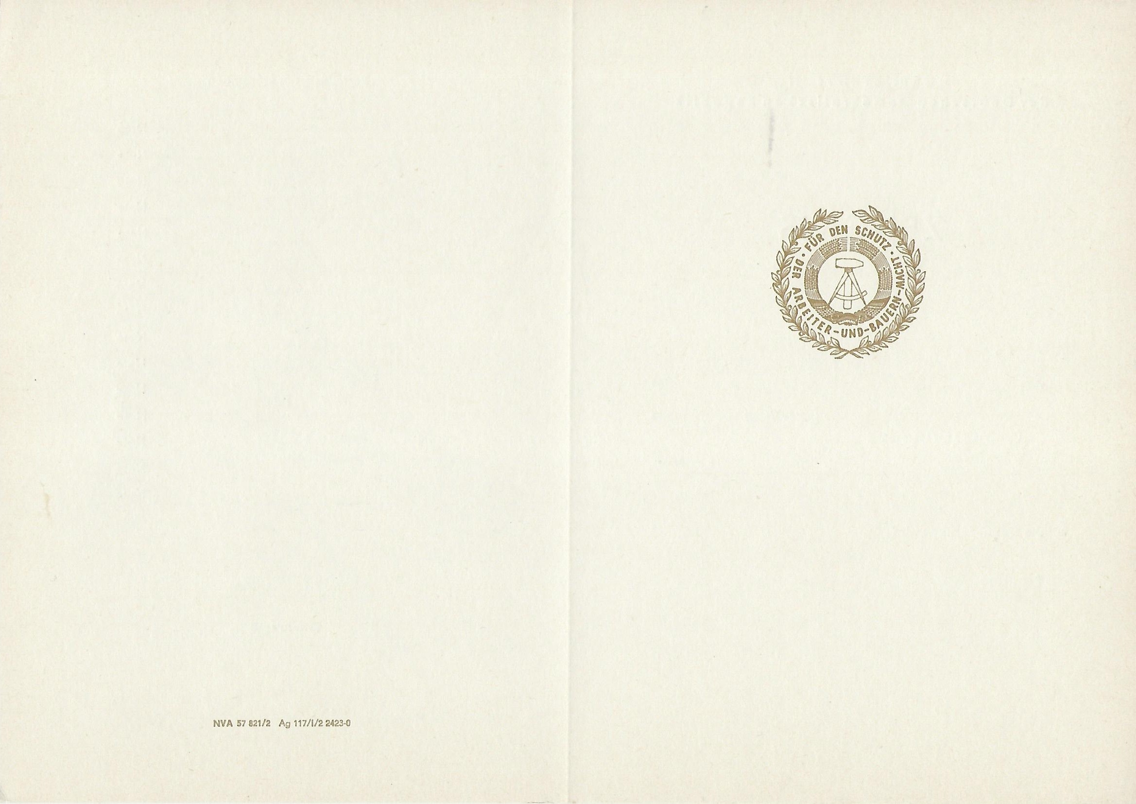 Verleihung : Medaille für Treue Dienste Freiwilliger Helfer beim Schutz der Staatsgrenze der DDR in Din A6 geklappt(Schriftzug Medaille Für.... sind erhaben und in reflektierender Farbe gedruckt was auf dem Bild nicht rüber kommt)1x mit Siegel und 1x blanco |
