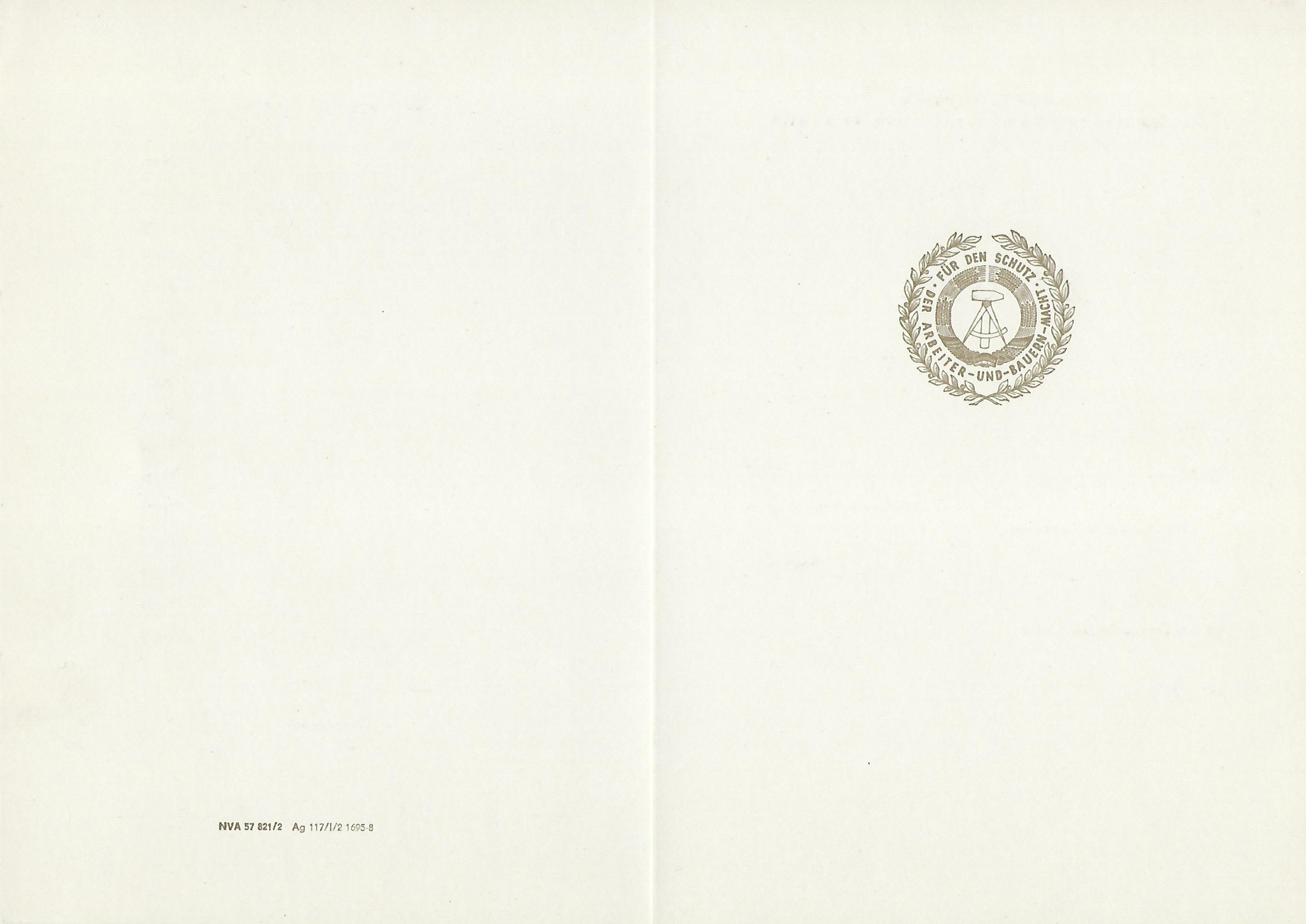 Verleihungsurkunde zur Jubiläumsmedaille "30 Jahre Nationale Volksarmee" in Din A6 geklappt(Abbildung des Emblems und der Schriftzug Jubiläums.... sind erhaben und in reflektierender Farbe gedruckt was auf dem Bild nicht rüber kommt) |